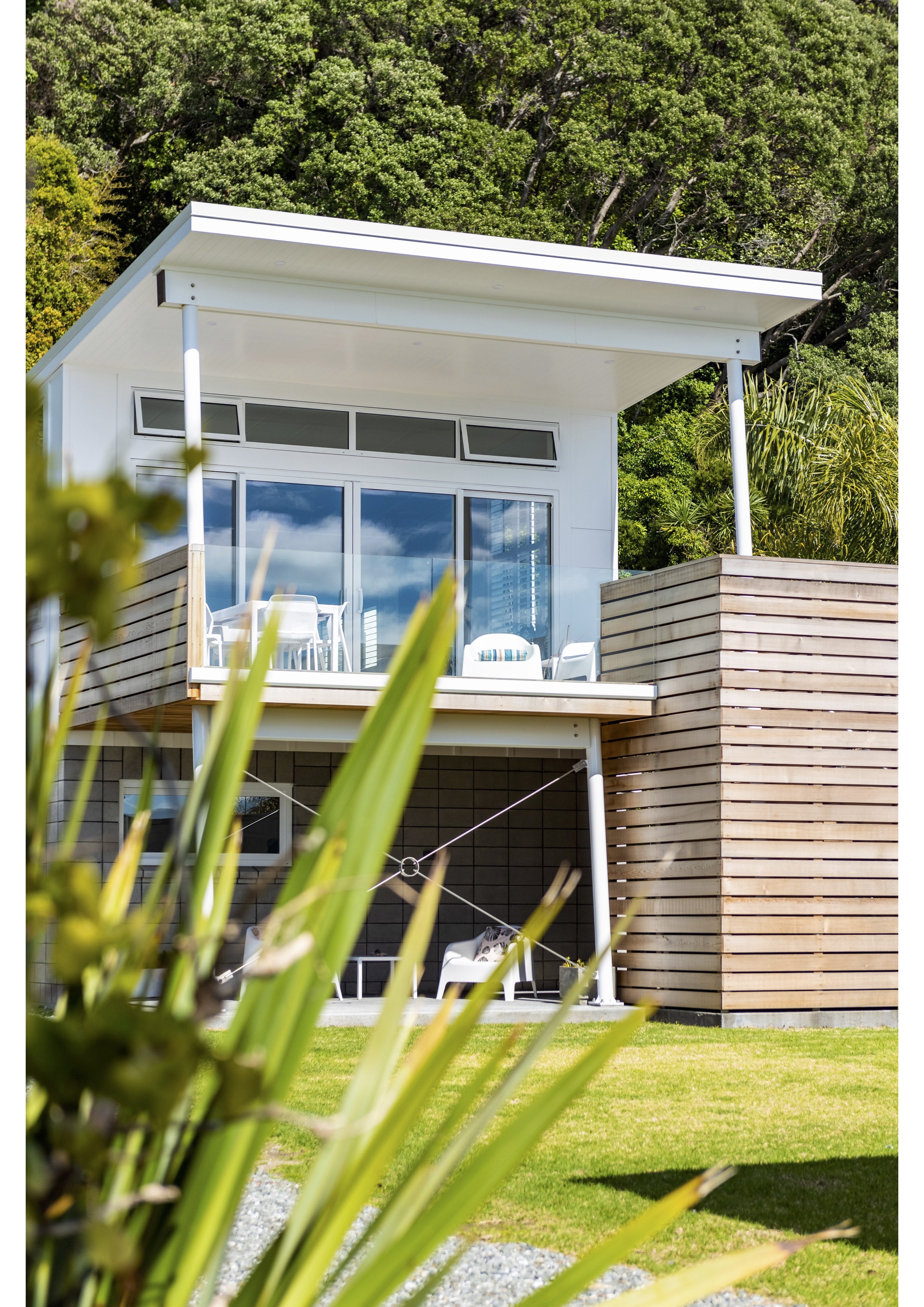 Architecturally designed bach nestled among lush Pohutukawa trees